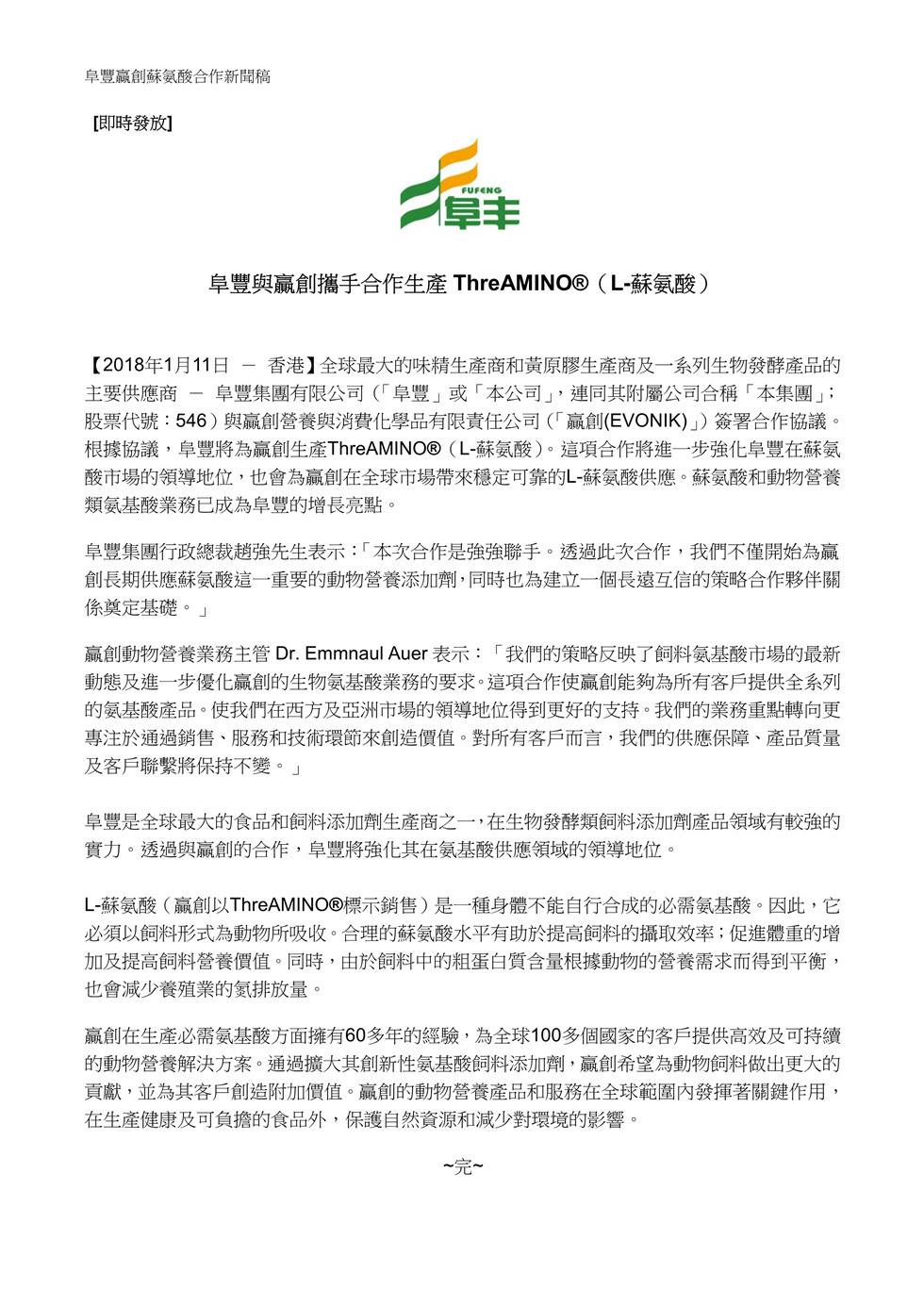 江南登陆入口-江南online(中国)与赢创携手合作生产ThreAMINO®(L-苏氨酸)