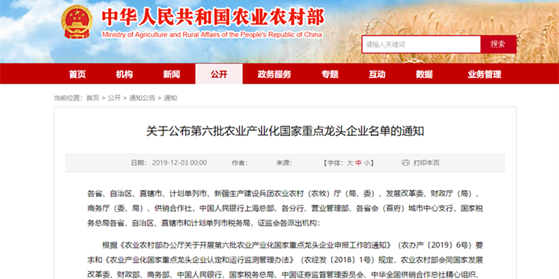 12月3日,农业农村部、国家发展改革委、财政部、商务部、中国人民银行、国家税务总局、中国证券监督管理委员会、中华全国供销合作总社联合印发通知,公布第六批 299 家农业产业化国家重点龙头企业名单,龙江江南登陆入口-江南online(中国)公司榜上有名。